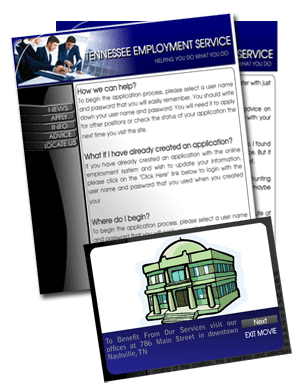 Tennessee Employment Service This is a complete 5 page business web site. It was created with Adobe Photoshop and Adobe Flash. The web site is professional, cleanly laid out, and easy to understand for anyone visiting. |