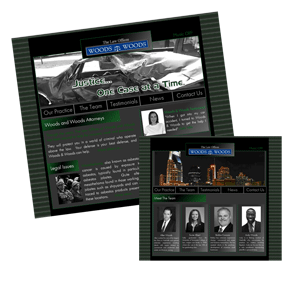 Woods and Woods This is a website designed for a Nashville, TN area law firm that uses stock photos and custom graphics to inform and bring clients in to the firm. The entire 6 page web site, with music bed and animated effects, was created to take up less than one megabyte, ensuring a fast loading time. |